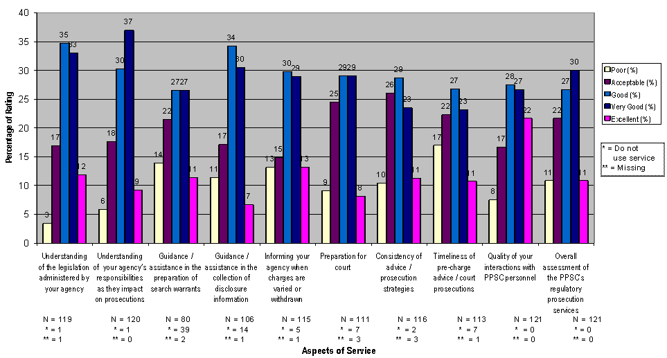 The survey questionnaireFootnote 2 addressed the full range of PPSC services, including drug, organized crime and regulatory prosecutions, as well as general legal advice, liaison and training. Using a five point scale, respondents were asked to qualify various aspects of these services as poor, acceptable, good, very good or excellent. These aspects include, but are not limited to the following: