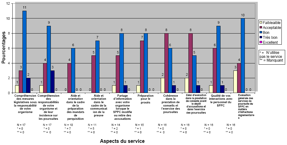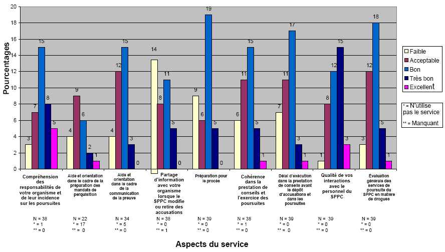 Le questionnaireNote de bas de page 2 portait sur tout l’éventail des services du SPPCdans les territoires: poursuites en vertu du Code criminel, en matière de drogues, de crime organisé et d’infractions réglementaires, conseils juridiques généraux, liaison et formation. À partir d’une échelle à cinq degrés, les répondants devaient qualifier chaque service reçu selon qu’il était faible, acceptable, bon, très bon ou excellent. Cette évaluation reposait notamment sur les aspects suivants:
