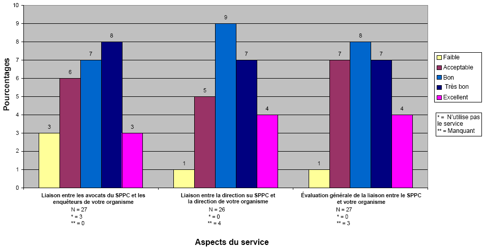 - Par contre, pour ce qui est d’aviser les organismes d’enquête de la modification ou du retrait d’accusations, de la qualité de la préparation pour le tribunal et de la rapidité des conseils préalables à l’inculpation ou des poursuites, le travail du SPPC a le plus souvent été considéré faible ou acceptable.Note de bas de page 7